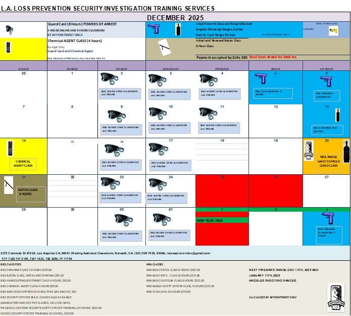 los Angeles Loss Prevention is a fully licensed in CA for Investigations (PI11754) and Security Training company. We specialize in training for security guards.