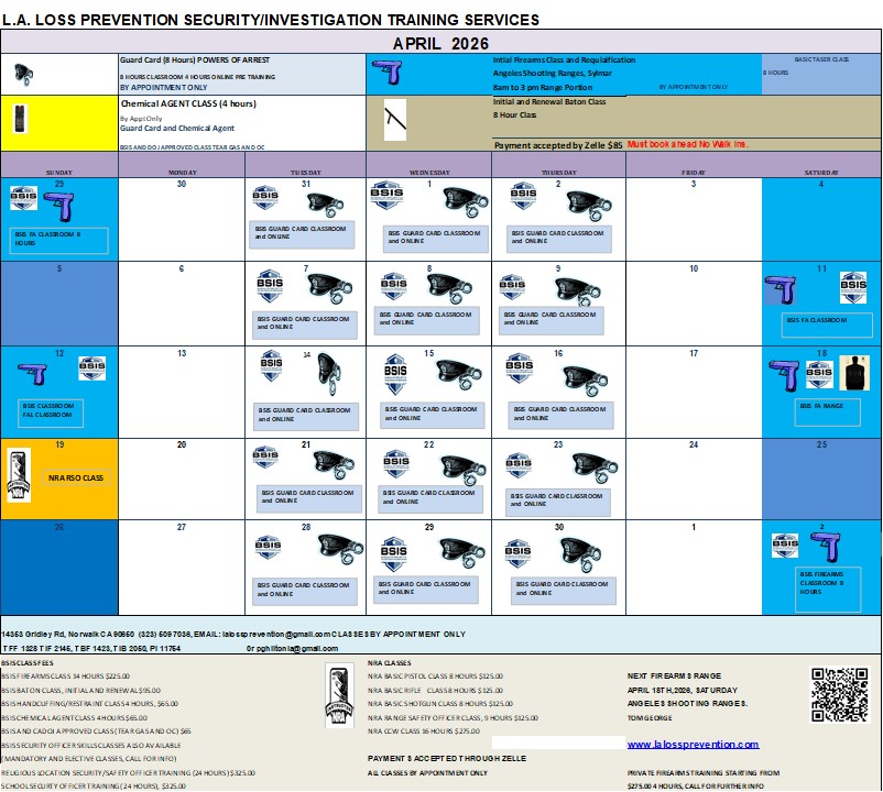 los Angeles Loss Prevention is a fully licensed in CA for Investigations (PI11754) and Security Training company. We specialize in training for security guards.